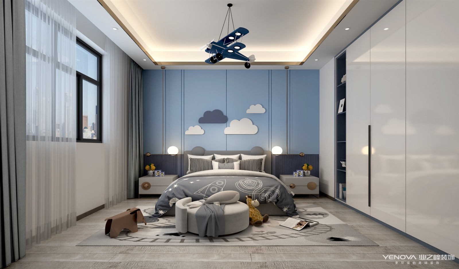 男孩房采用鶠蓝色作为主色,鷃蓝是蓝天,蕴藏一往无前和果敢而行,冷峻山坡、匀速而起、滑翔翱游,释放疲倦与浮躁,诉说自由和向往。