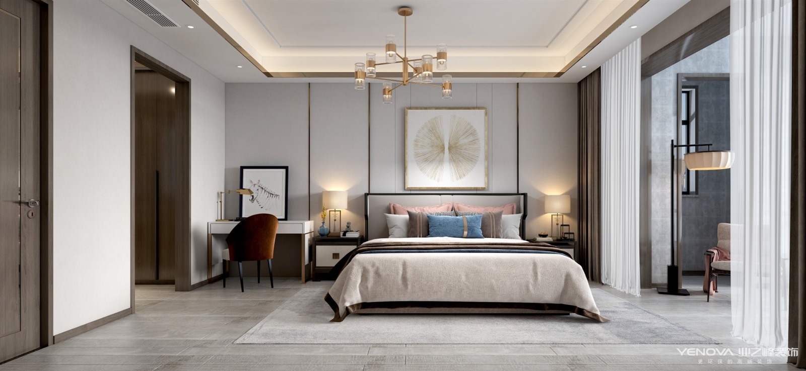 主卧稍显区分,更重轻奢元素,浅卡其的莫兰迪色增加空间温馨氛围,硬包结合香槟金金属线条,既显质感又增情调。