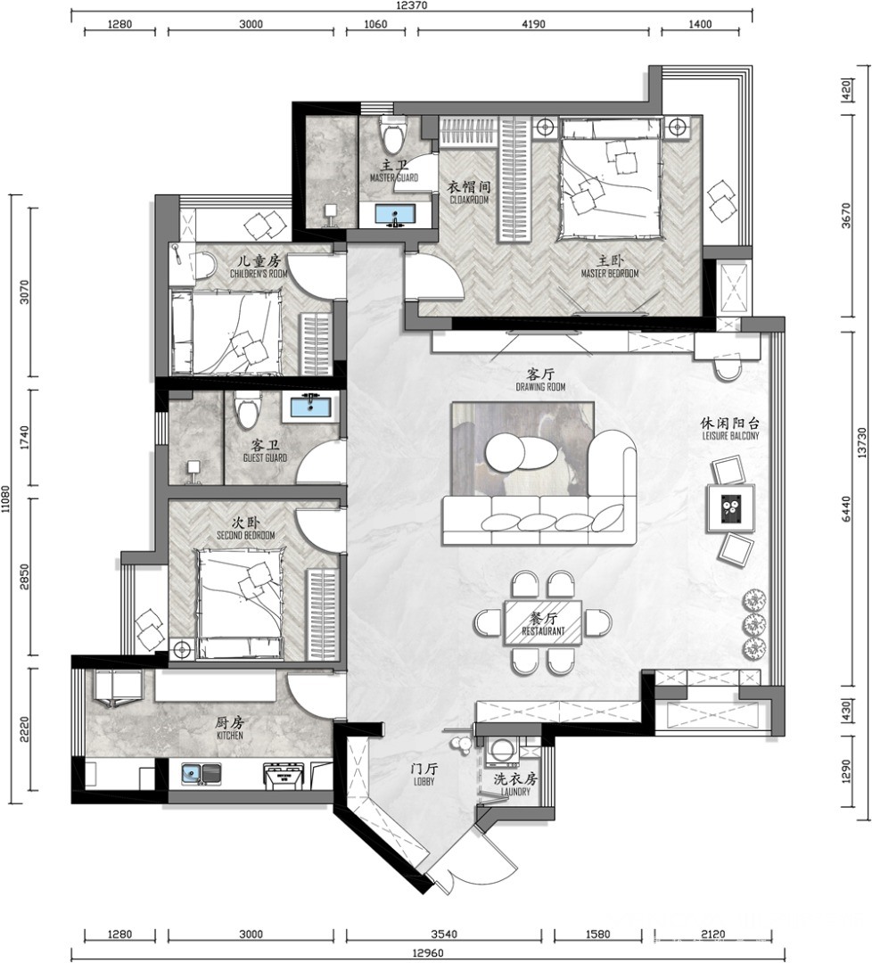 结合业主需求和实际楼梯结构、楼层的朝向和采光,我在整体房屋色调上选择冷色调进行调和,用冷暖对比增加空间的变化和延展性,材料选用冷色调的大砖、水墨白纹理的岩板、桦木装饰板,来搭配业主的黑胡桃实木家具。