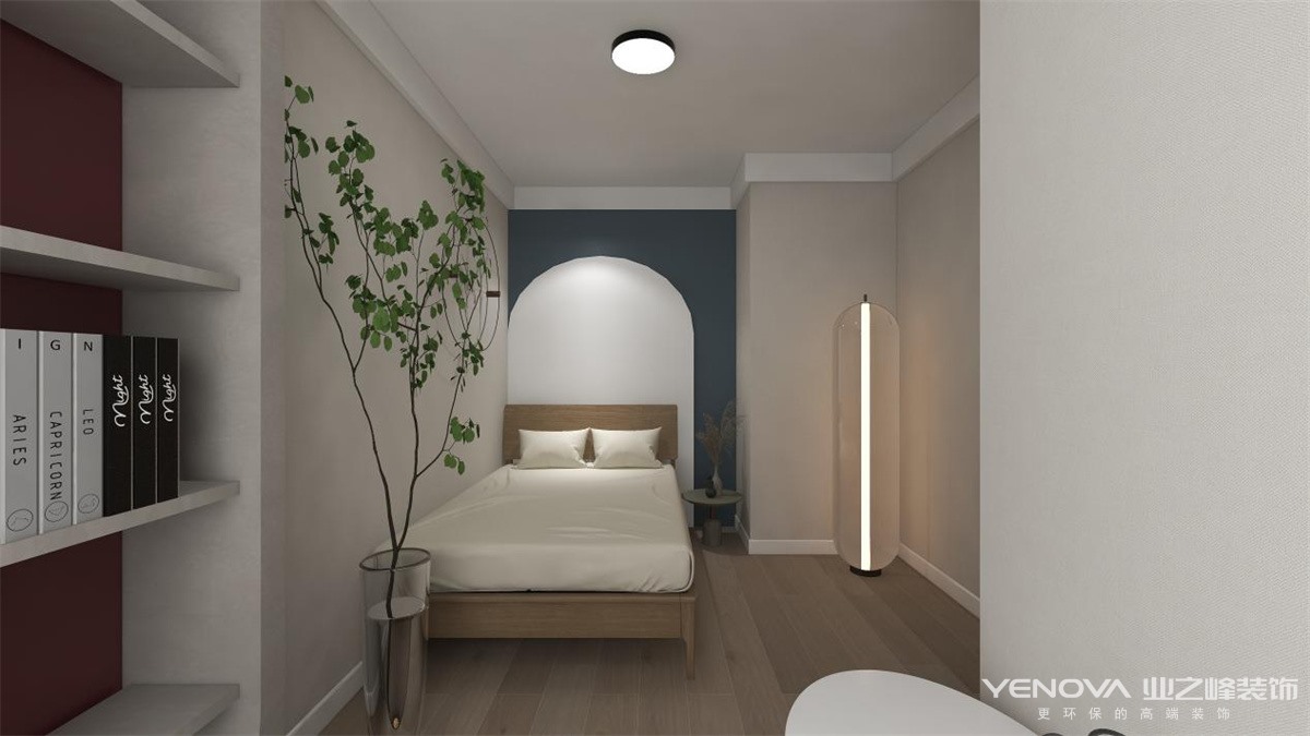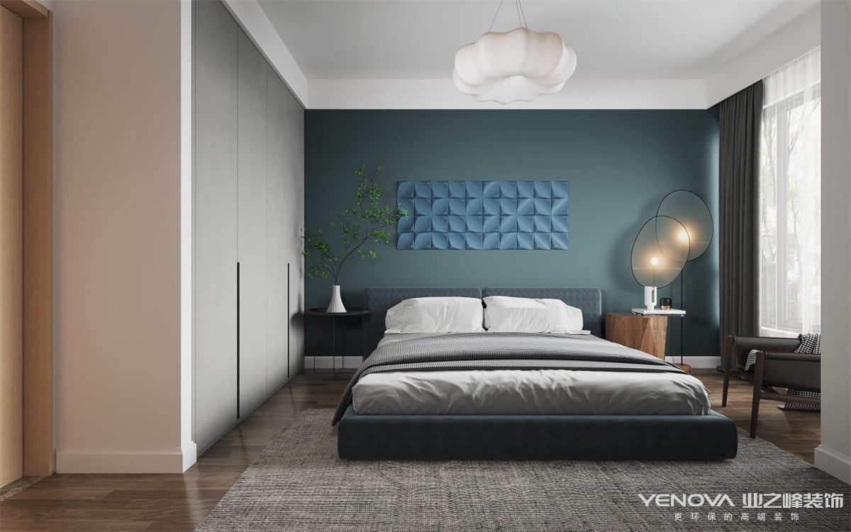 主卧延续着客厅的复古元素,用宁静的蓝色,氤氲出浪漫和柔美的格调。简洁利落的衣柜迎合着卧室主色调,大储藏空间确保了卧室内整洁有序。