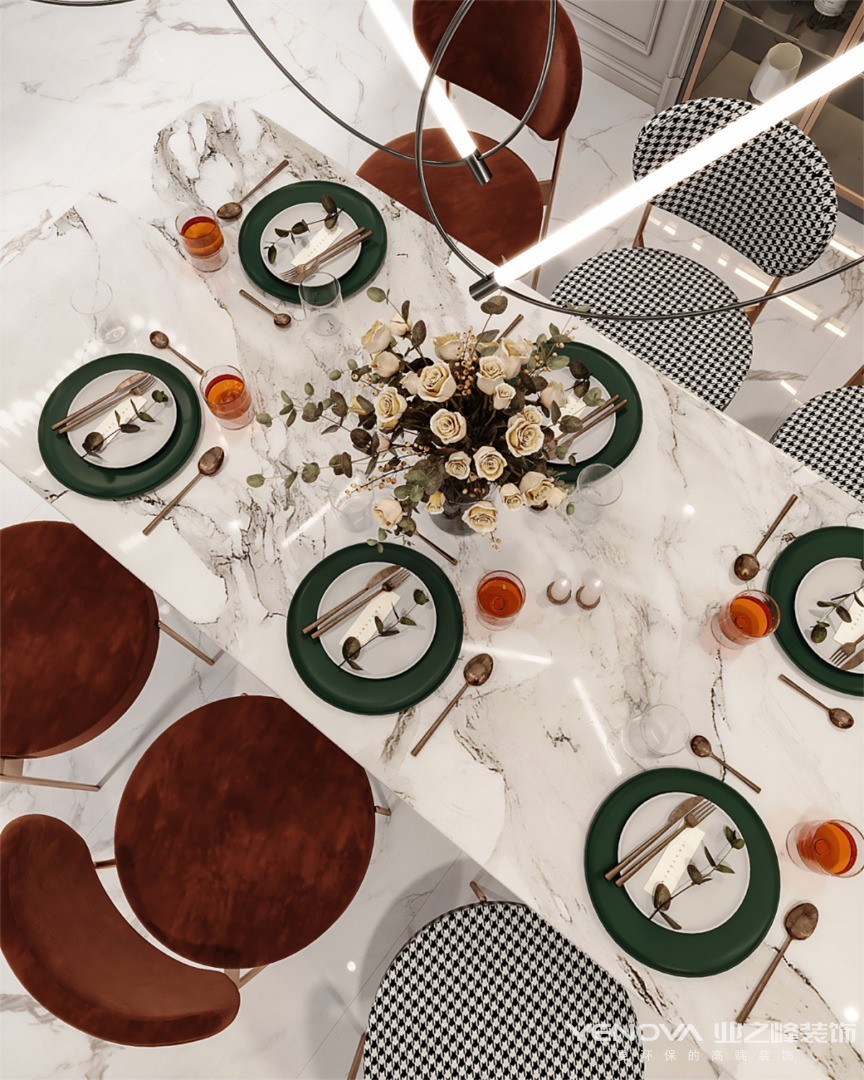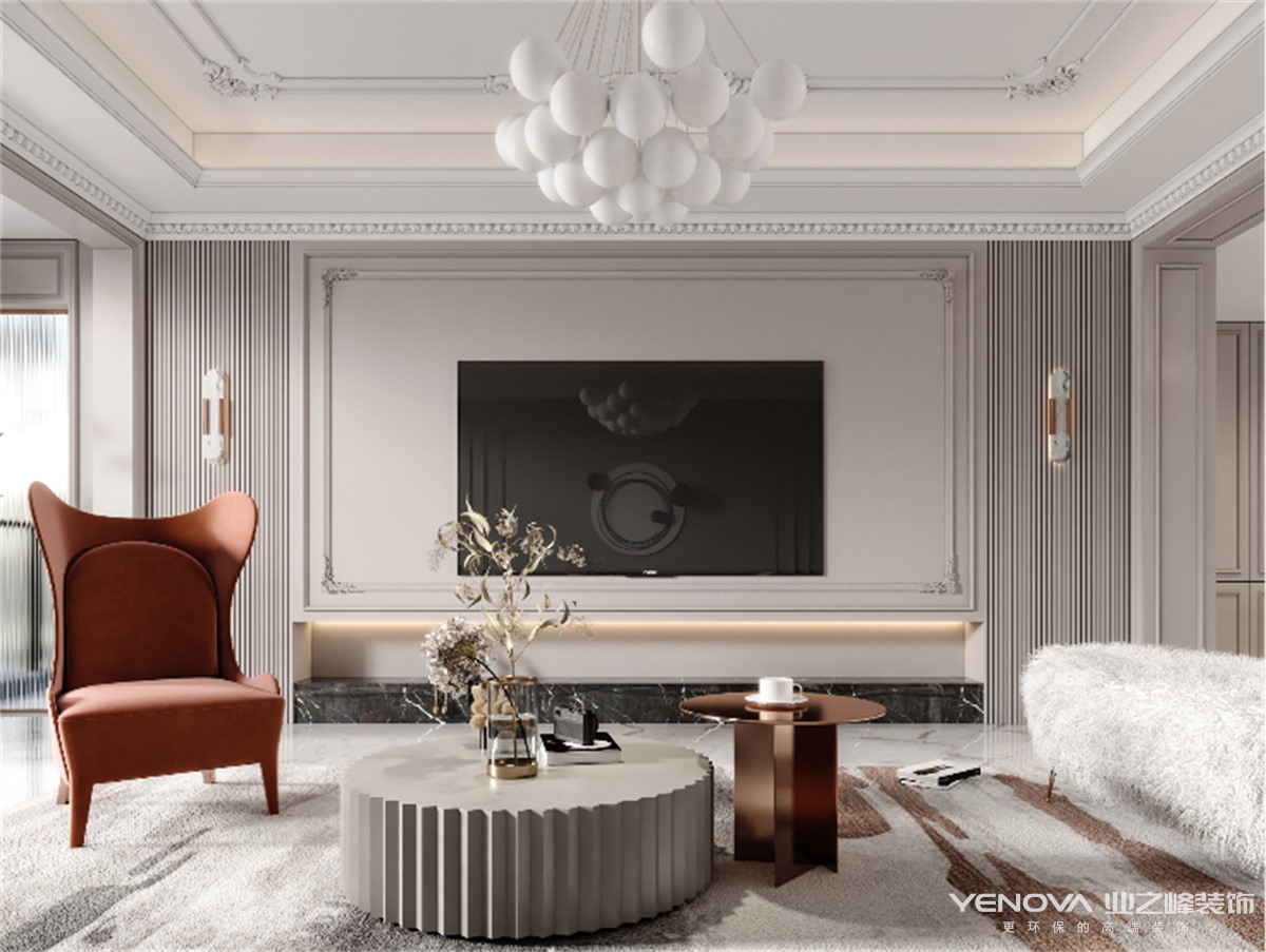 造型上与背景墙线条元素相呼应,更具视觉延伸感,为生活增添了仪式感。陈设的三两组软装使空间灵动而优雅,随性打开的书本恰好点亮了室内的文艺氛围。仿佛还原了与家人聊天、品茶、阅读的生活情境,在空间艺术韵律的熏陶下,演绎极具个性的法式轻奢风情。