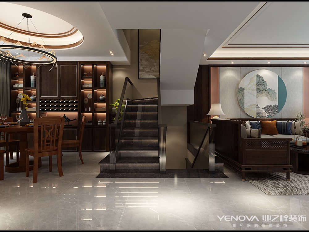 本方案采用中式的设计方案,客厅挂画后方摆放嵌入式书架增加储物空间,餐厅摆放的大型酒柜,增加储物面积,楼梯采用玻璃扶手简单大气,客厅后面壁布点缀整体色彩。