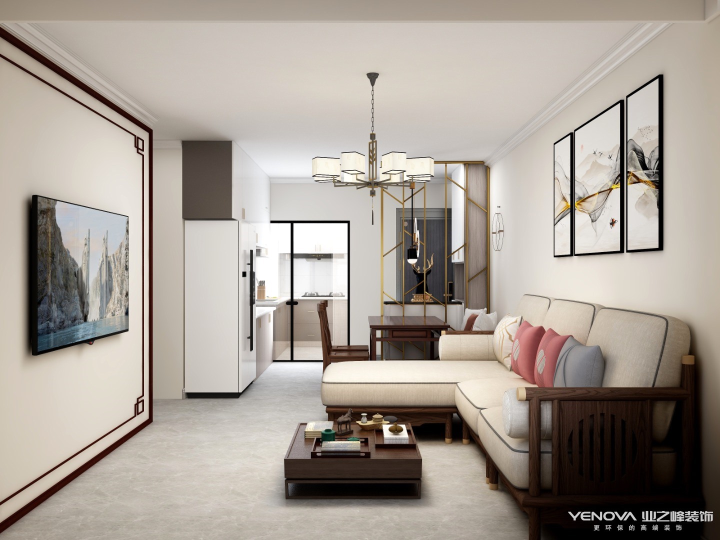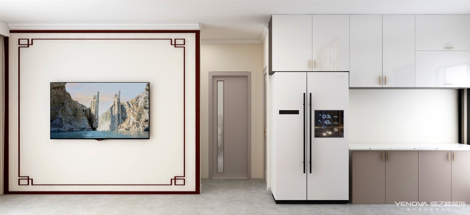 本案为两室一厅厨一卫户型,业主喜欢新中式,由于户型限制,需要进行部分格局改造才能实现真正舒适的居住空间,首先,设计师在玄关增设了玄关柜,营造了一个视觉缓冲区和落尘区并增强了全屋的收纳功能。其次,修改了厨房的开门方向,使业主烹饪后出入厨房的动线更加流畅。对调了电视背景墙和沙发的方向,配合玄关隔断,使人进入后第一视觉区落在一面精致的电视背景墙上,大大提升了美感。