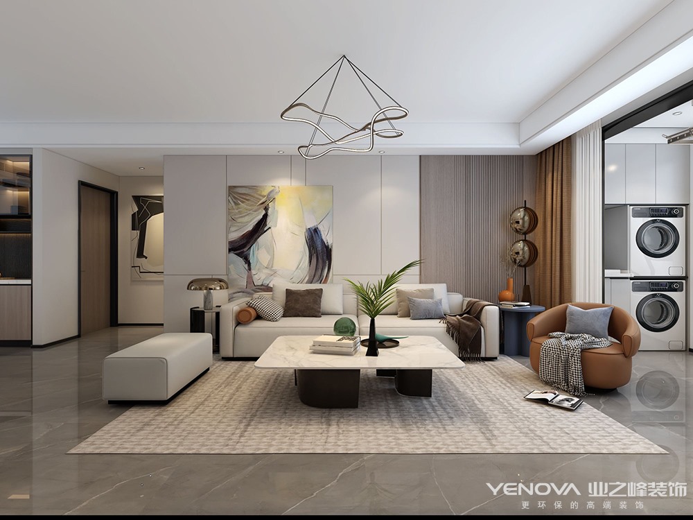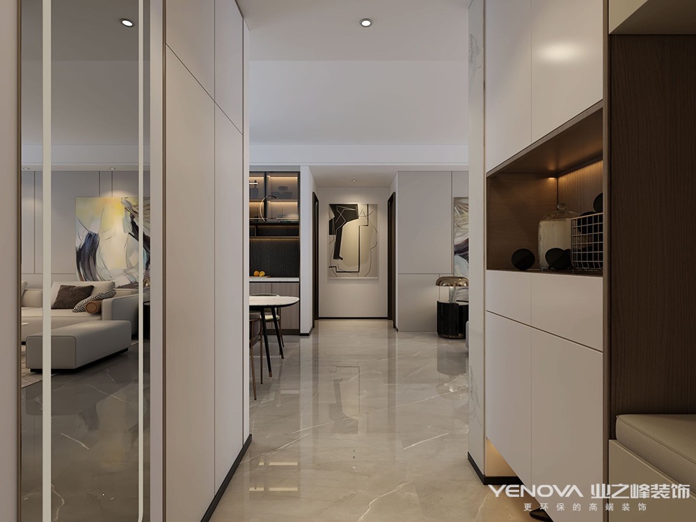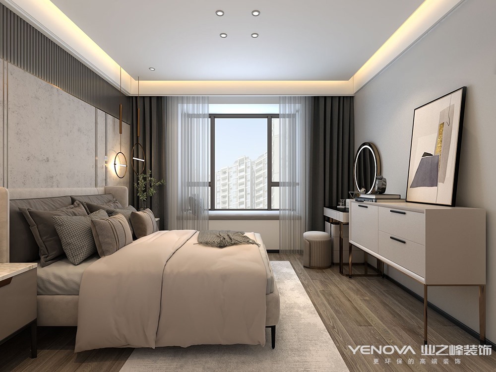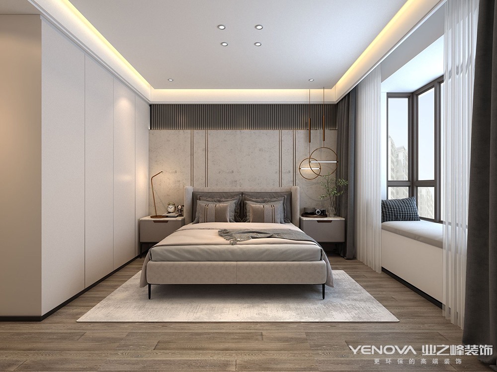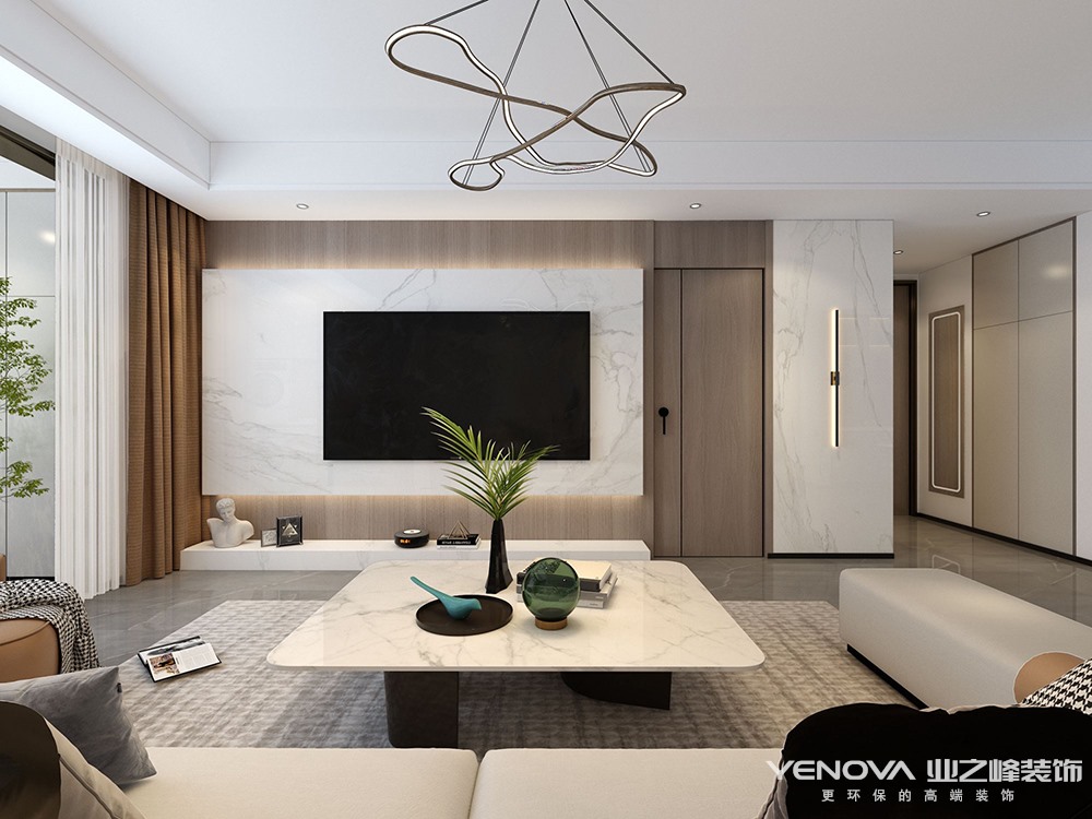 全屋整体以现代简约为主,搭配线条感体现极简的感觉,同时用木质墙板提高全屋的色调,体现全屋温馨风格。电视背景墙采用瓷砖上墙和墙板结合整体造型将卧室门做成隐形门,提高整体协调统一性。